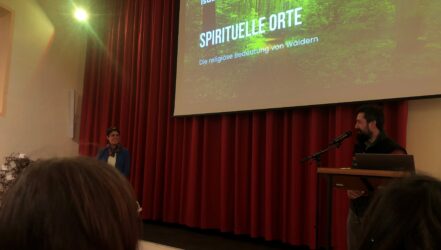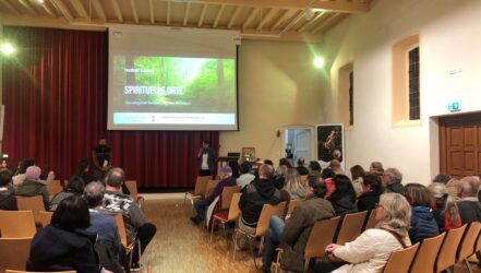 Der Vortrag spannte einen Bogen von der Natur- und Menschbeziehung in indigenen Kulturen, den Germanen und Kelten und ihrer engen Beziehung zum Wald und Bäumen, Neopaganismus, dem Christentum und Heiligen Stätten bis zu neuen Strömungen wie Waldbaden und dem neuen Trend zu Bestattungswäldern.