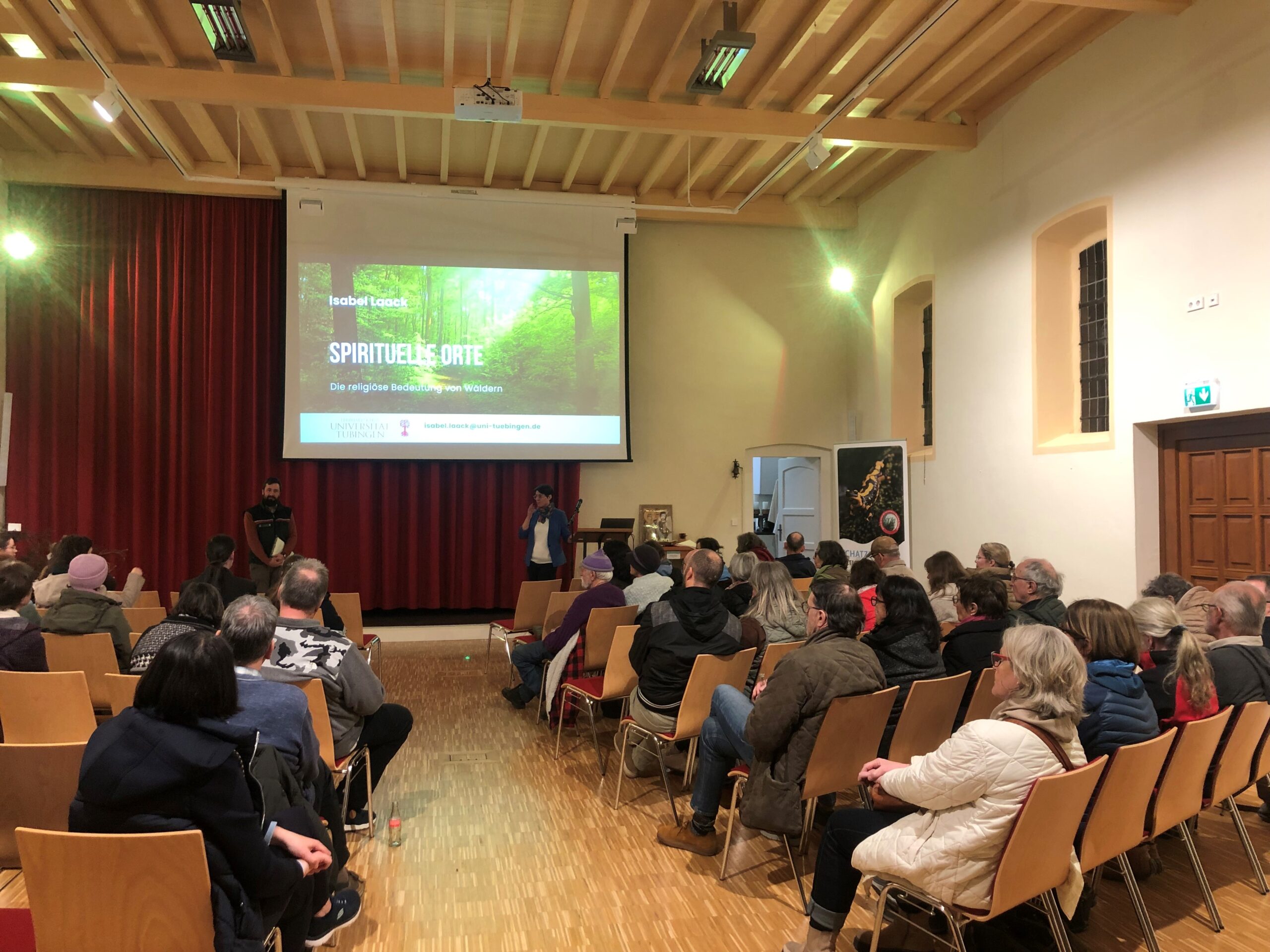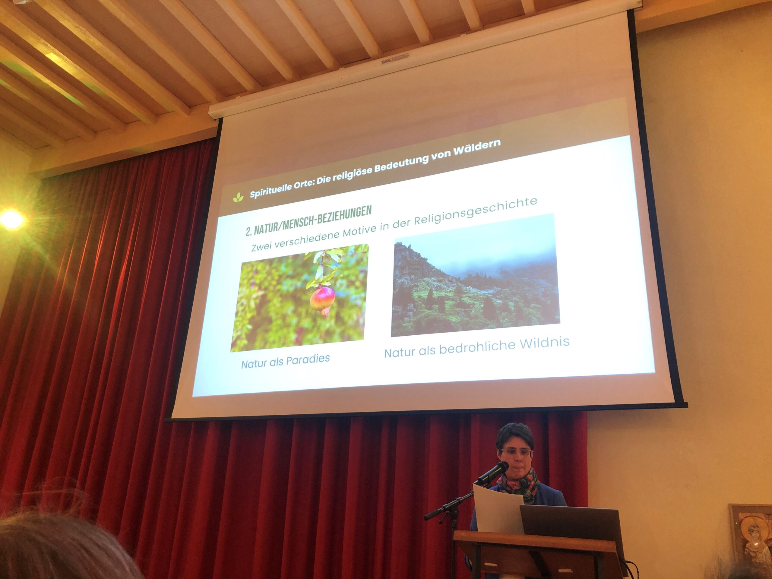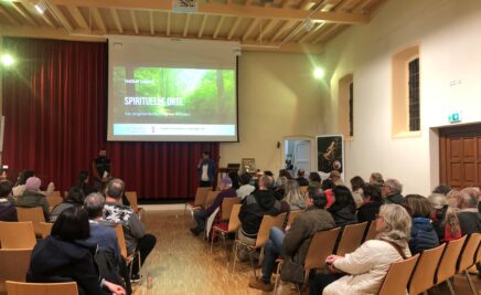 Der Vortrag spannte einen Bogen von der Natur- und Menschbeziehung in indigenen Kulturen, den Germanen und Kelten und ihrer engen Beziehung zum Wald und Bäumen, Neopaganismus, dem Christentum und Heiligen Stätten bis zu neuen Strömungen wie Waldbaden und dem neuen Trend zu Bestattungswäldern.