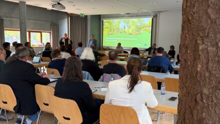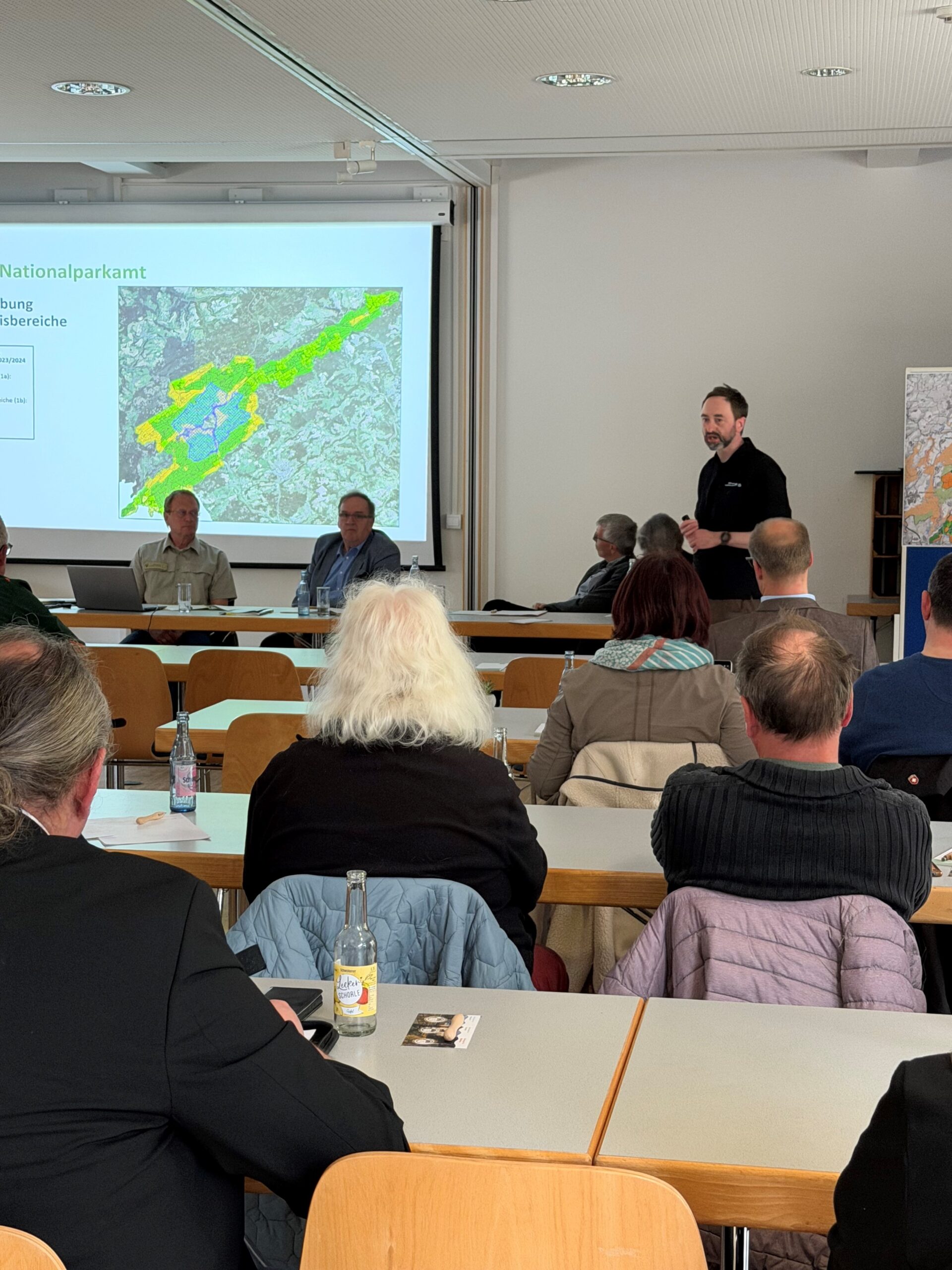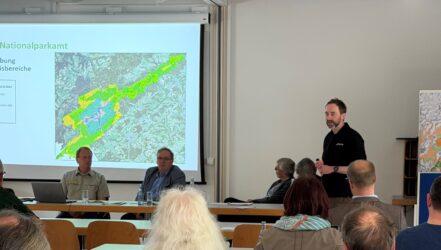 Dr. Martin Mörsdorf, stellvertretender Amtsleiter und Abteilungsleiter für Forschung, Biotop-, und Wildtiermanagement, zeigte die aktuelle Fortschreibung der Wildnisbereiche. Auf der Karte des Nationalpark-Gebiets präsentierte er, wie die Entwicklung dieser Kernbereiche des Nationalparks in den letzten Jahren fortgeschritten ist. Im Lauf des Frühjahrs wird der Nationalpark bereits die 65%-Marke erreichen. Damit ist der Nationalpark Hunsrück-Hochwald bereits nach 11 Jahren dem 75%-Ziel sehr nahe. Als Entwicklungsnationalpark soll dieses Ziel nach 30 Jahren erreicht werden.