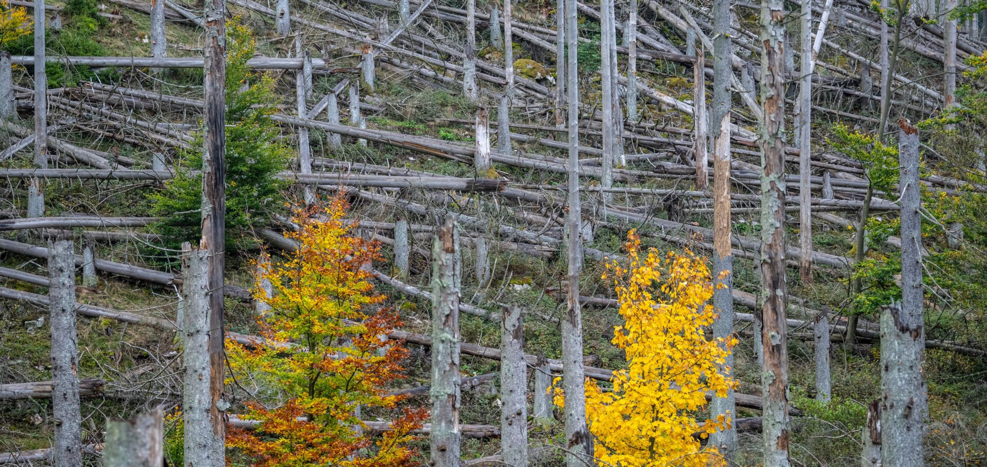 Auch im Nationalpark Hunsrück-Hochwald führt dies zu einem radikalen Umbruch. Gerade auf den fichtengeprägten Standorten gibt es in den unberührten Kernbereichen Flächen, in denen die Naturdynamik