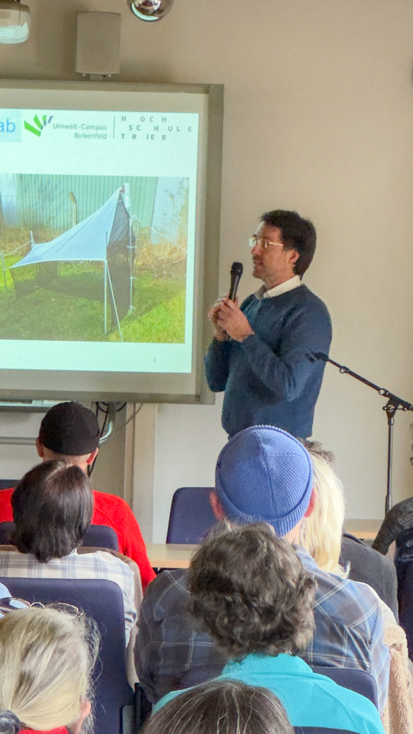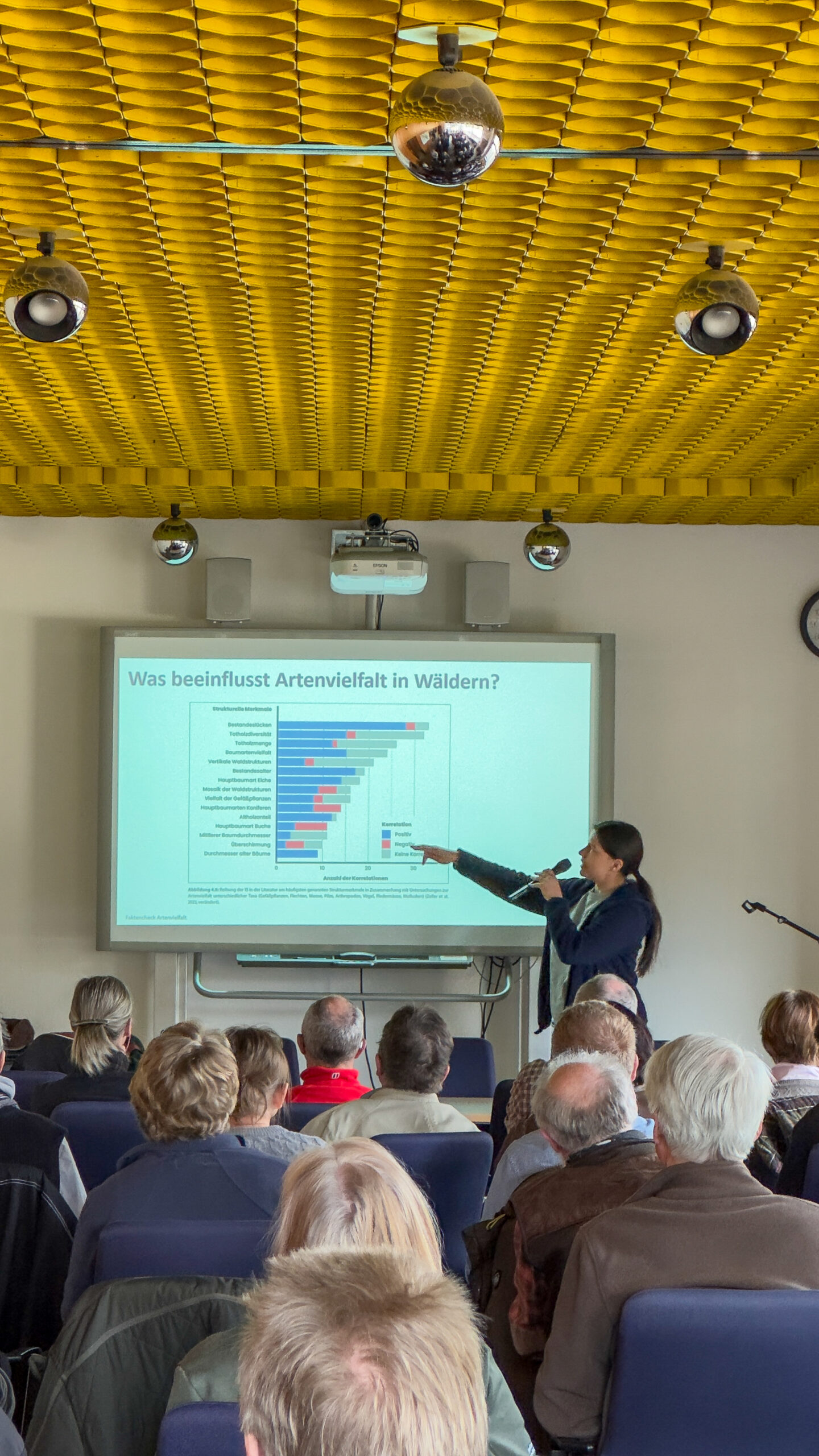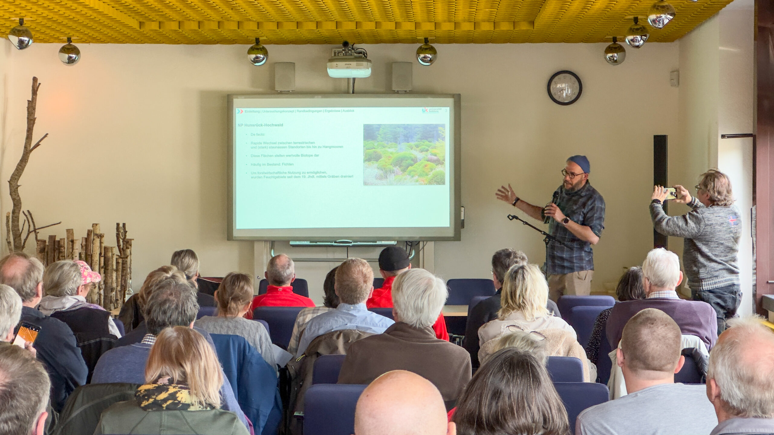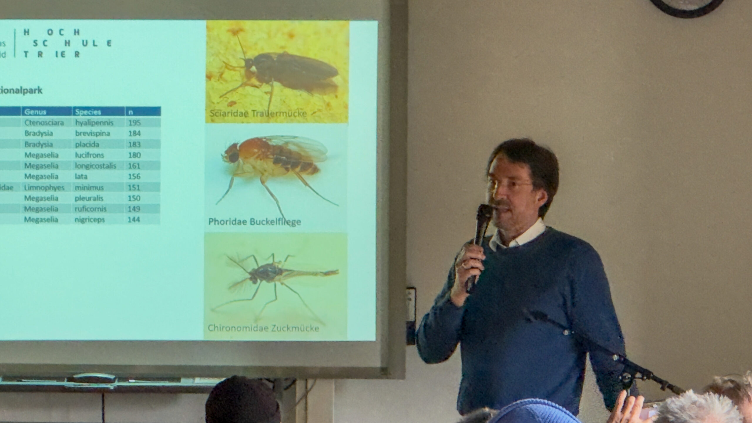Am Samstag im bis auf den letzten Platz gefüllten Vortragssaal des Rangerstützpunkts vermittelten vier Fachbeiträge einen Eindruck über aktuelle Forschungs-Themen des Nationalparks. Dr. Martin Mörsdorf und Johannes Hoffmann aus der Abteilung 3 des Nationalparkamts referierten über das neue Forschungsprojekt FORTUNA, dass die Entwicklung ehemaliger Kalamitätsflächen erforscht. Dr. Kerstin Pierick von der Georg-August-Universität in Göttingen stellt die Erkenntnisse aus dem Forschungsvorhaben BetaFor vor, an dem sich der Nationalpark Hunsrück-Hochwald auch beteiligt hat. Hierbei wurde die Biodiversität in Buchenwäldern mit unterschiedlichen Waldstrukturen und Totholzvorkommen untersucht. Die Entwicklung der Insektenvielfalt entlang eines Höhengradienten im Nationalpark Hunsrück-Hochwald erforschte Prof. Stefan Stoll vom Umwelt-Campus mit seinem Team – 116 Arten der hier entdeckten Insekten befinden sich auf der Roten Liste. Zur Dynamik des Wasserabflussgeschehens der renaturierten Moorflächen, auch im Hinblick auf die Erderwärmung stellten Dr. Julian J. Zemke und Kollegin ihre Ergebnisse der Wassermessungen vor.